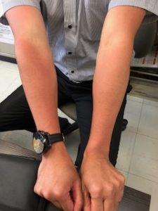 この良いお天気の中 土日に趣味のスポーツの練習をしてきたお兄さんの腕や顔はとんでもなく真っ赤っかになりまして…月曜日に出社してびっくりです。